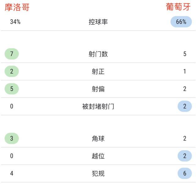 上半场葡萄牙的控球更多,但摩洛哥的射门次数反而更多。