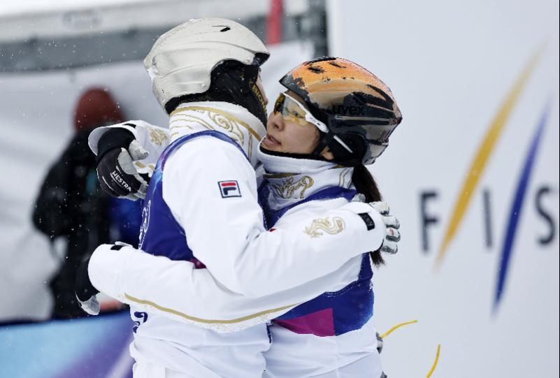 徐梦桃(右)安慰王心迪。新华社发